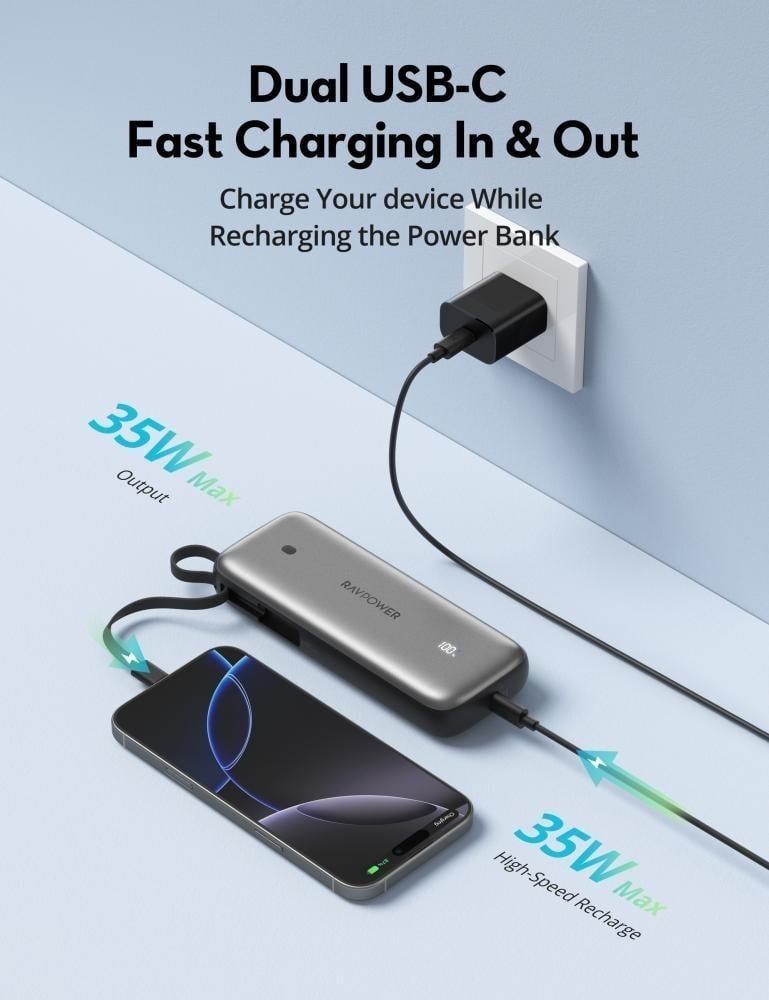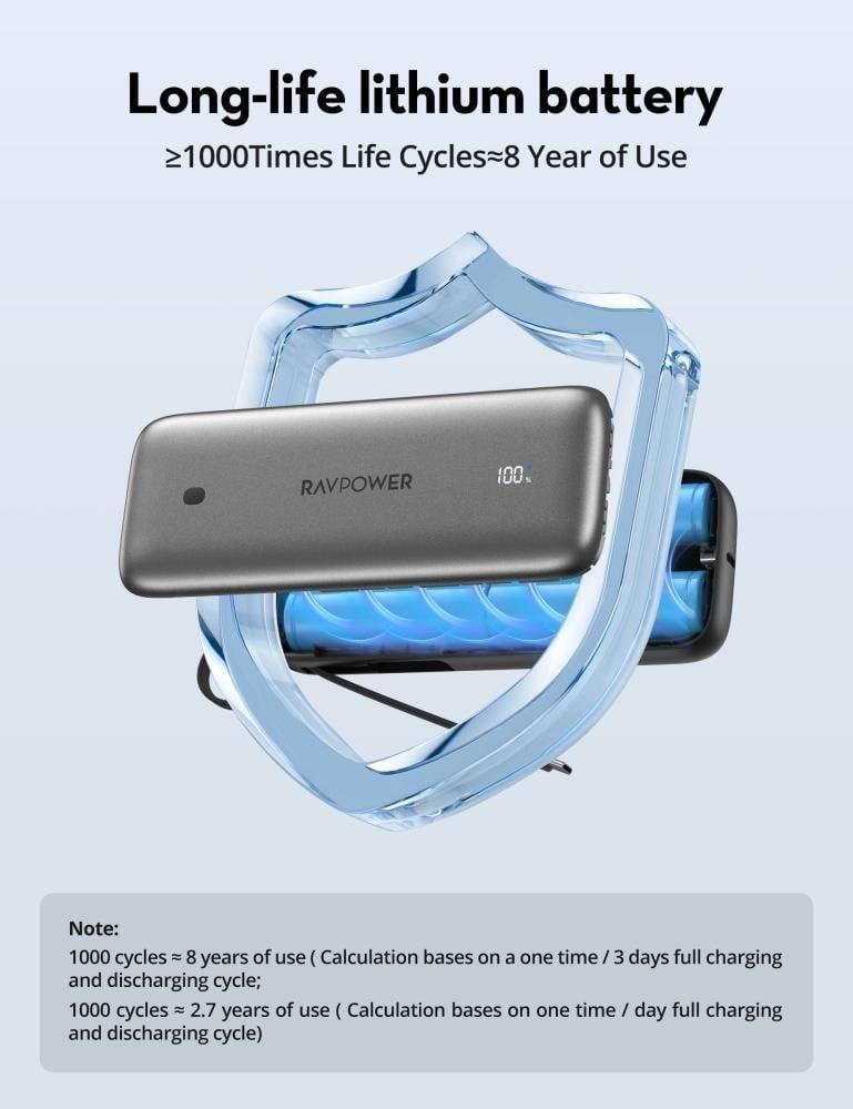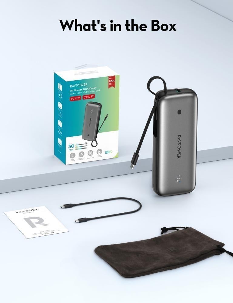 بطارية RAVPower بسعة 20000 مللي أمبير هي الحل الأمثل للشحن السريع أثناء التنقل. بفضل قدرة 30 واط ودعم الشحن السريع ثنائي الاتجاه عبر منفذ USB-C، تقدر تشحن أجهزتك بكفاءة عالية وفي وقت قياسي. البطارية مزودة بسلك Type-C مدمج ومنفذين إضافيين (USB-A وUSB-C)، وتناسب جميع احتياجاتك اليومية.