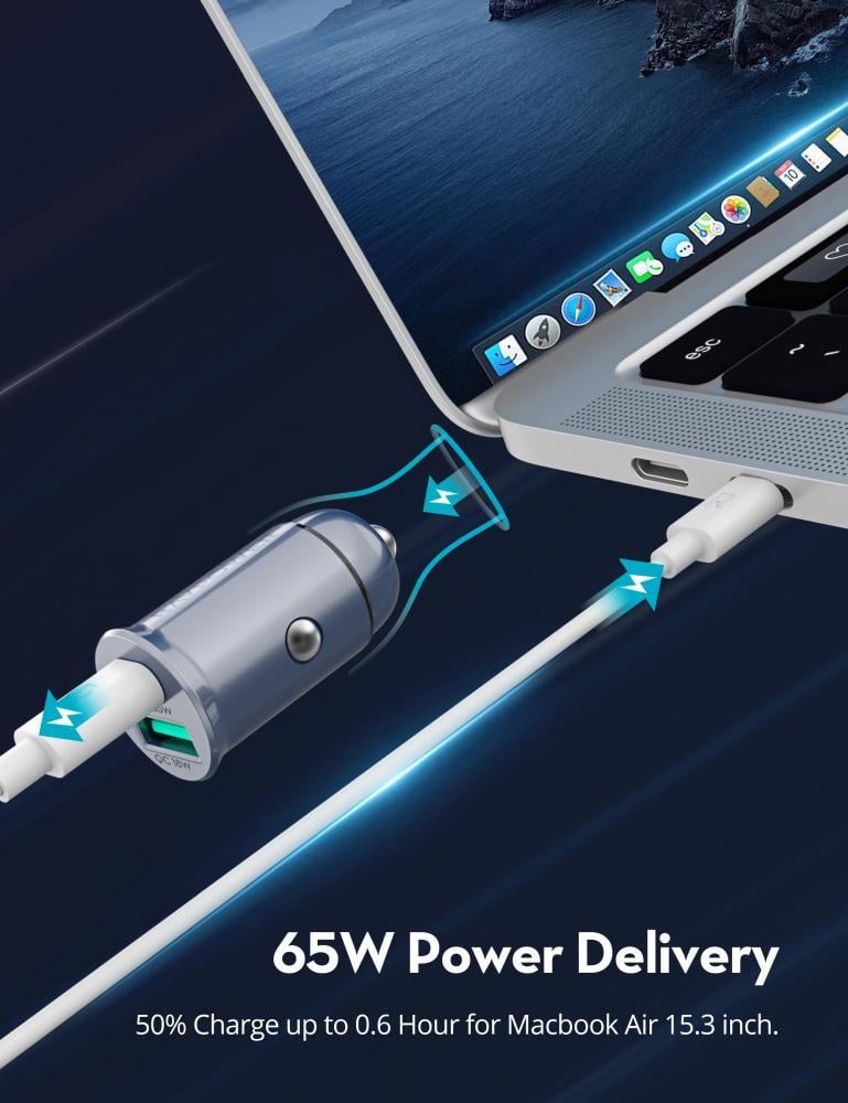 شاحن سيارة راف بور ميني بقوة 65 واط بمنفذ تايب سي ومنفذ يو اس بي - اسود