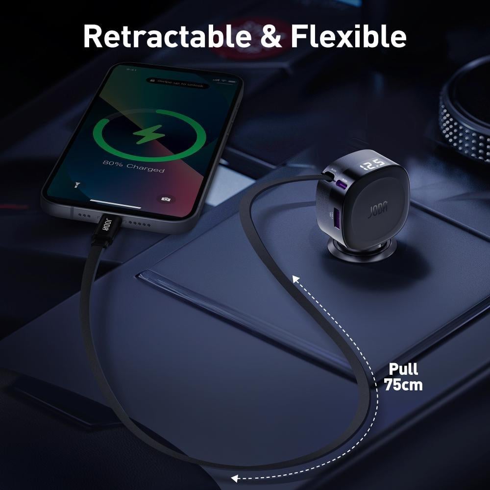 جودا -شاحن سيارة كار فليكس 60 واط مع كابل مدمج بمنفذين USB-C و USB-A - أسود